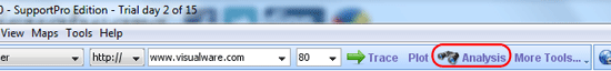 1. Toolbar - The ping history toolbar contains two views (analysis and ping plot) and a more drop down menu. The more drop down menu allows you to add a pane from another currently open tab. For example if you were viewing the history for 200.200.200.200 and you wanted to see how it differered from the live data you could click on the more drop down menu and add the traceroute ping plot pane from a seperate 200.200.200.200 traceroute you were performing.